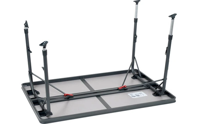 Tavolo da campeggio molto stabile e di alta qualità. Le guide in alluminio supplementari integrate nella parte inferiore del tavolo e i tubi delle gambe del tavolo, robusti e rinforzati, forniscono una stabilità extra. Il piano del tavolo è resistente al calore e impermeabile.