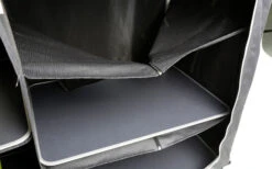 Un telaio preassemblato in alluminio, sul quale viene tirato un rivestimento di alta qualità in poliestere resistente, forma l’ossatura degli armadietti color antracite. I canali di design in poliestere rip-stop resistenti all’abrasione della copertura, in cui è incorporata una garza di ventilazione sul retro, garantiscono un montaggio e uno smontaggio rapido, i ripiani sono semplicemente inseriti. Tutti i piedi del giradischi sono regolabili in altezza e assicurano un supporto sicuro anche su superfici irregolari. L’estremità superiore della robusta costruzione è formata da un ripiano. Una pratica borsa per il trasporto e la conservazione è inclusa nella consegna.